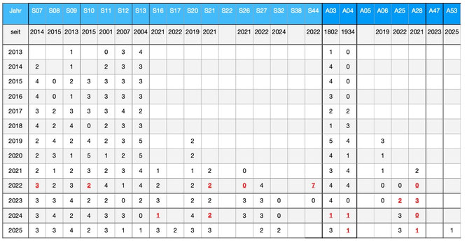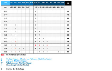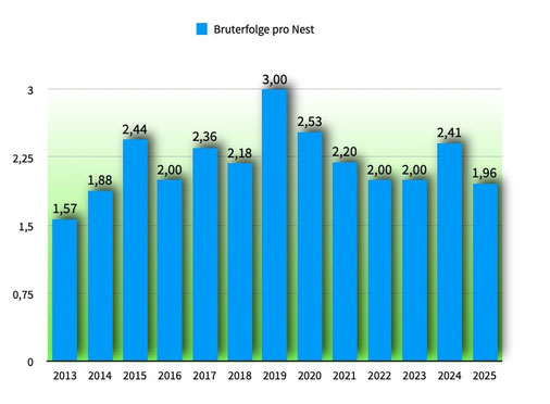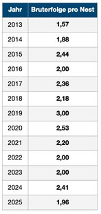 Aus der Tabelle geht hervor, dass der Durchschnitt der ausgeflogenen Jungstörche seit 2014 fast immer über dem zur Erhaltung der Art ermittelten Durchschnitt von 1,8 - 2,0 Jungstörchen pro Nest lag. So war 2025 nicht ganz so ein erfolgreiches Storchenjahr wie die Jahre davor.