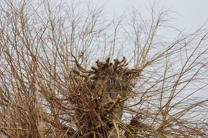 Die geschneitelte Kopfweide nutzte das Storchenpaar, um auf einem der Haupttriebe ein Nest zu errichten.