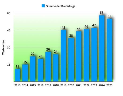 Seit einigen Jahren entwickelt sich die Population jedoch sehr positiv. Im Jahr 2016 waren es 8 Nester, in 2019 sogar schon 15 Brutplätze, in 2025 dann 25 Brutplätze in denen erfolgreich gebrütet wurde. Auch die Anzahl der aufgeflogenen Jungstörche entwickelt sich prächtig. Im Jahr 2013 wurden lediglich 11 Junge groß gezogen, 2016 waren es schon 20 und in den Jahren 2022 und 2024 wurden alle Rekorde gebrochen, jeweils 58 Jungstörche verließen die elterlichen Brutstätten. Diese Jahr (2025) waren es etwas weniger, es war wohl im Frühjahr zu trocken. Um die Art zu erhalten, müssen ca. 1,8 bis 2,0 Jungstörche je Nest ausfliegen.